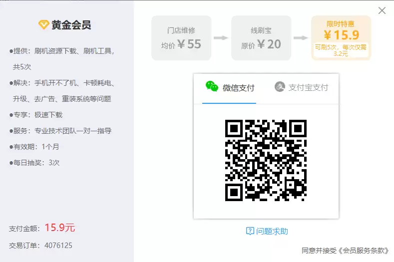 3、加入vip。这一步需要手机扫码付款(当前支持微信/支付宝),购买对应特权的会员。成为会员后,在会员期内就可以无限制使用所有刷机资源了。