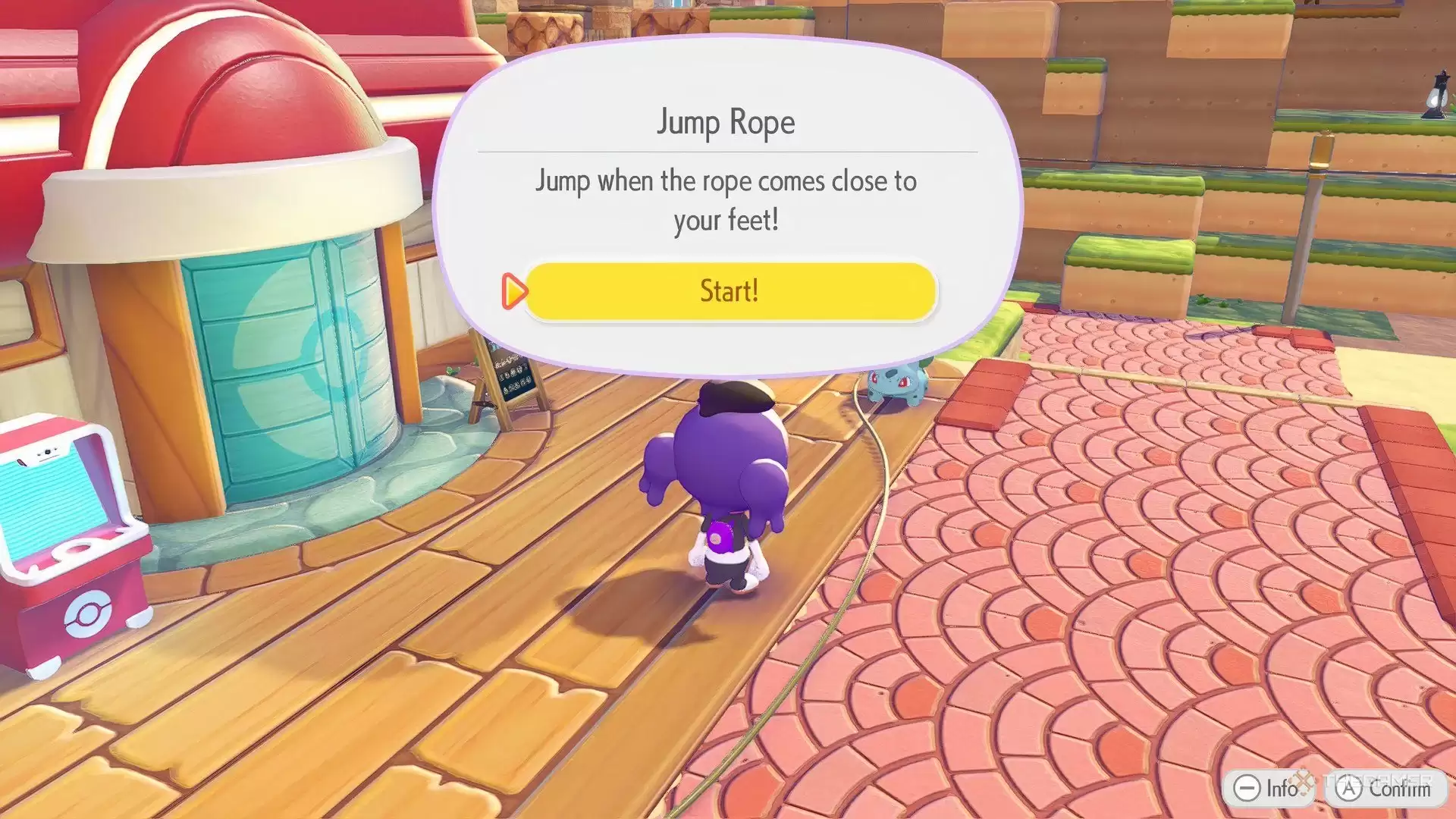 和妙蛙种子对话后,它会详细介绍比赛规则。核心很简单:跟它一起跳绳,冲击特定分数来获取奖励。你也可以叫上朋友一起比拼。
