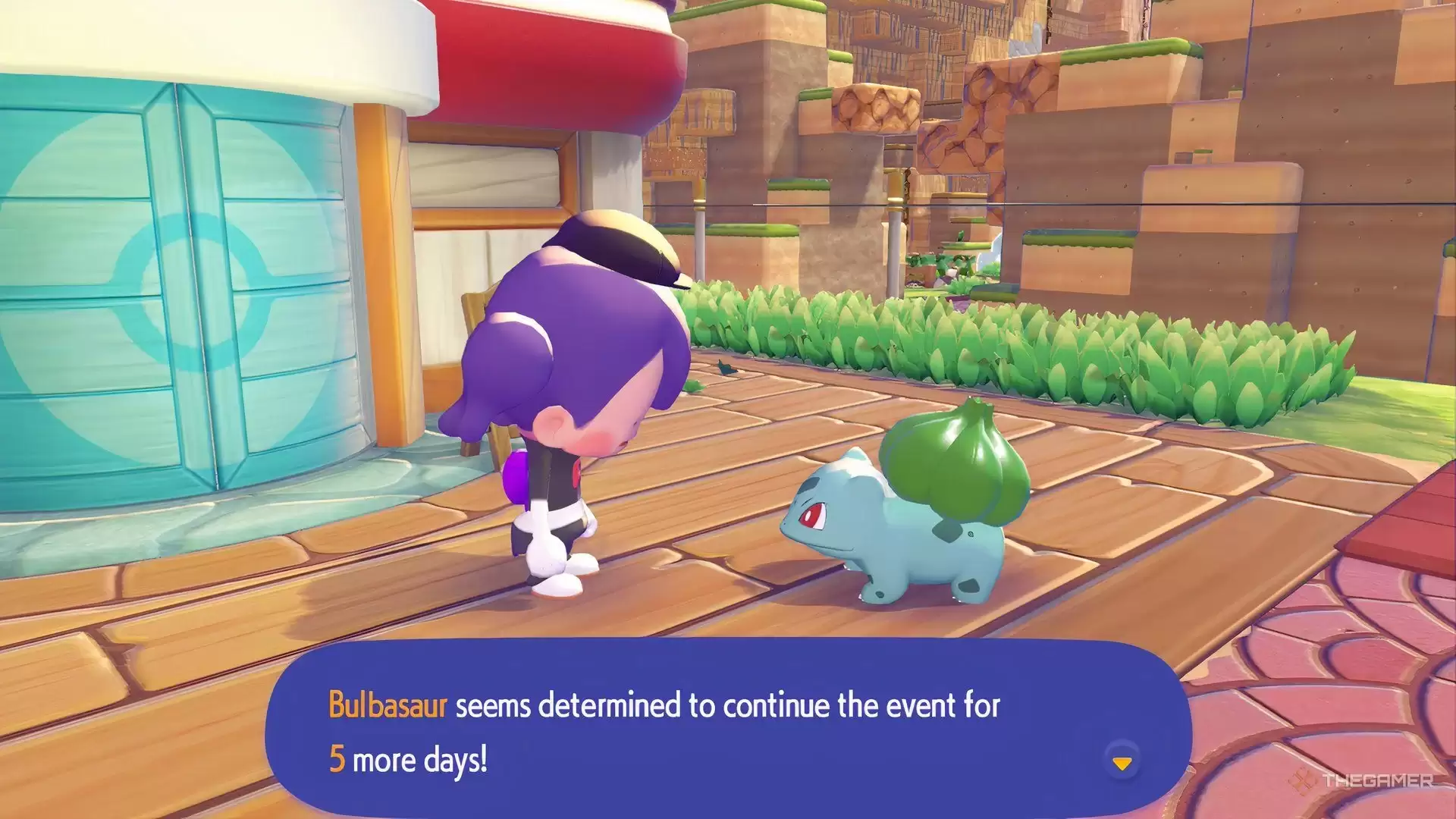 只要你的Switch 2系统时间在活动期内,一进入《Pokemon Pokopia》,你就会在宝可梦中心附近看到妙蛙种子。无论你在哪个区域,它都会准时出现在那个区域的宝可梦中心门口,头上顶着气泡对话框,跃跃欲试地想和你比赛。如果没看到它提起比赛,不妨去和蔓藤怪博士(Professor Tangrowth)聊两句。