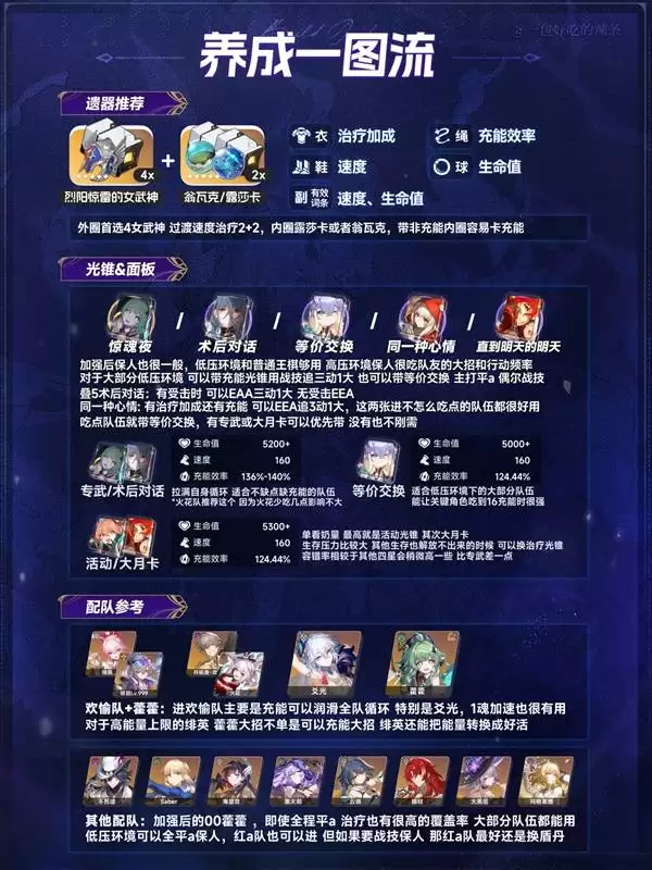 另一个值得关注的亮点,是1魂效果的调整。原本的“禳命”状态持续时间被下放,同时附带的12%速度加成价值凸显。要知道,目前生存位能提供加速效果的角色屈指可数,藿藿1魂和风堇2魂是其中的代表。这个加速能有效解决一些配速难题——比如,之前如果你的卡芙卡怎么也堆不到167的速度阈值,带上1魂藿藿,问题或许就迎刃而解了。