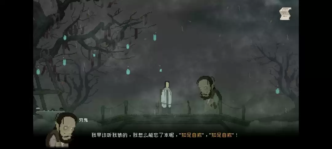 接着,去桥上找那位“穷鬼”对话。对话内容别光跳过,里面“知足自戒”这四个字是关键线索,后面用得着。