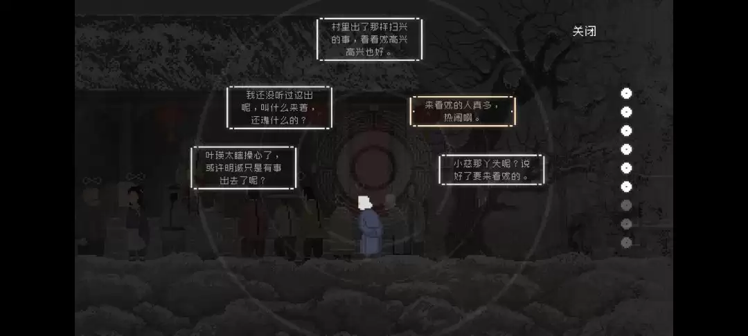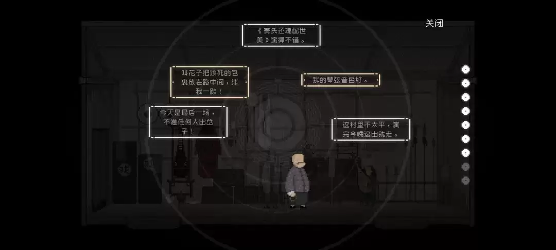 逆梦开始后,重点来了。长按班主头上的两个想法——“我的琴弦音色好”和“叫花子把该死的包裹放在路中间,绊我一跤”。这样操作,能分别获得两个关键感知:“班主的琵琶”和“遗落的东西”。