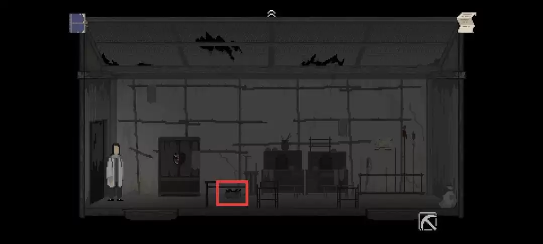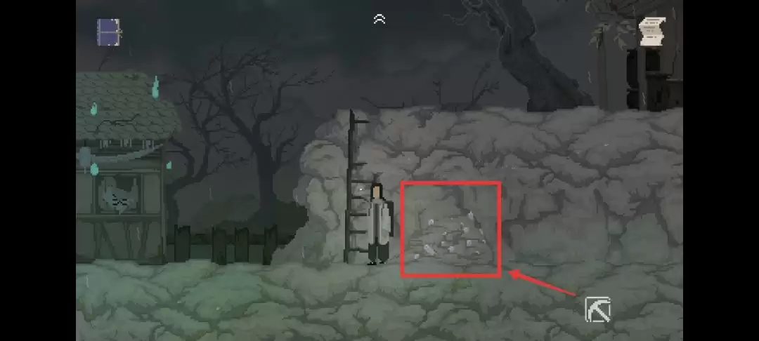 从后台出来,往右边走。在一处断掉的梯子旁边,能看到一堆碎石。这时候,之前拿到的铁镐就派上用场了,敲开碎石,取得“硝石”。