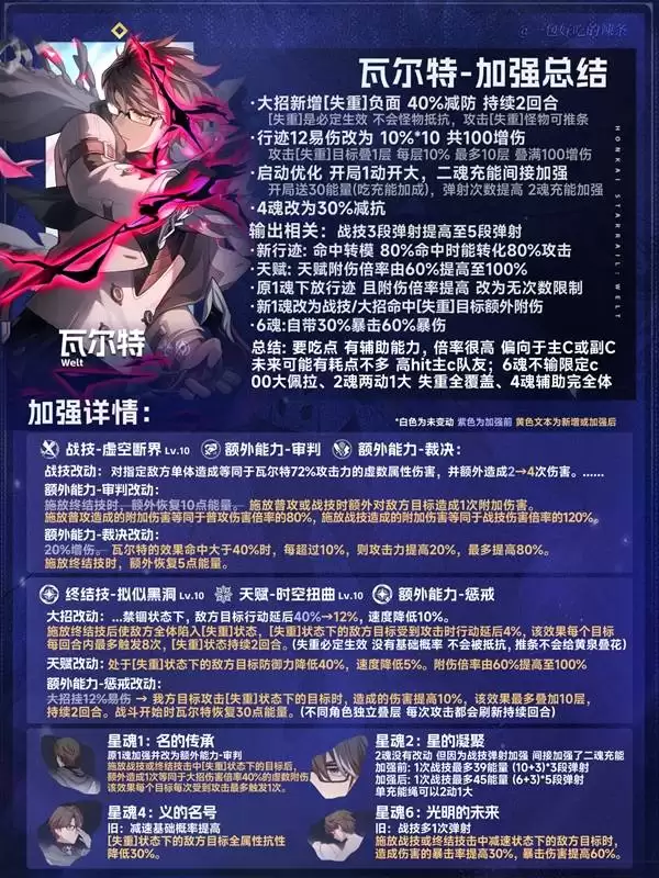 先说说大家最关心的结论:0+0状态下的瓦尔特,如果队伍不额外为他提供战技点,可能会面临能量缺口,导致大招的增益效果衔接不上,因此不太推荐作为优先培养的选择。不过,一旦解锁2魂,他的机制就变得完整了,无论是担任主C、辅助,还是进入“三拐一”体系,都有了尝试的资本。4魂提供的30%减抗,让他彻底成为辅助位的完全体。而6魂则完美解决了角色自身双暴属性难以堆叠的痛点,输出能力再上一个台阶。