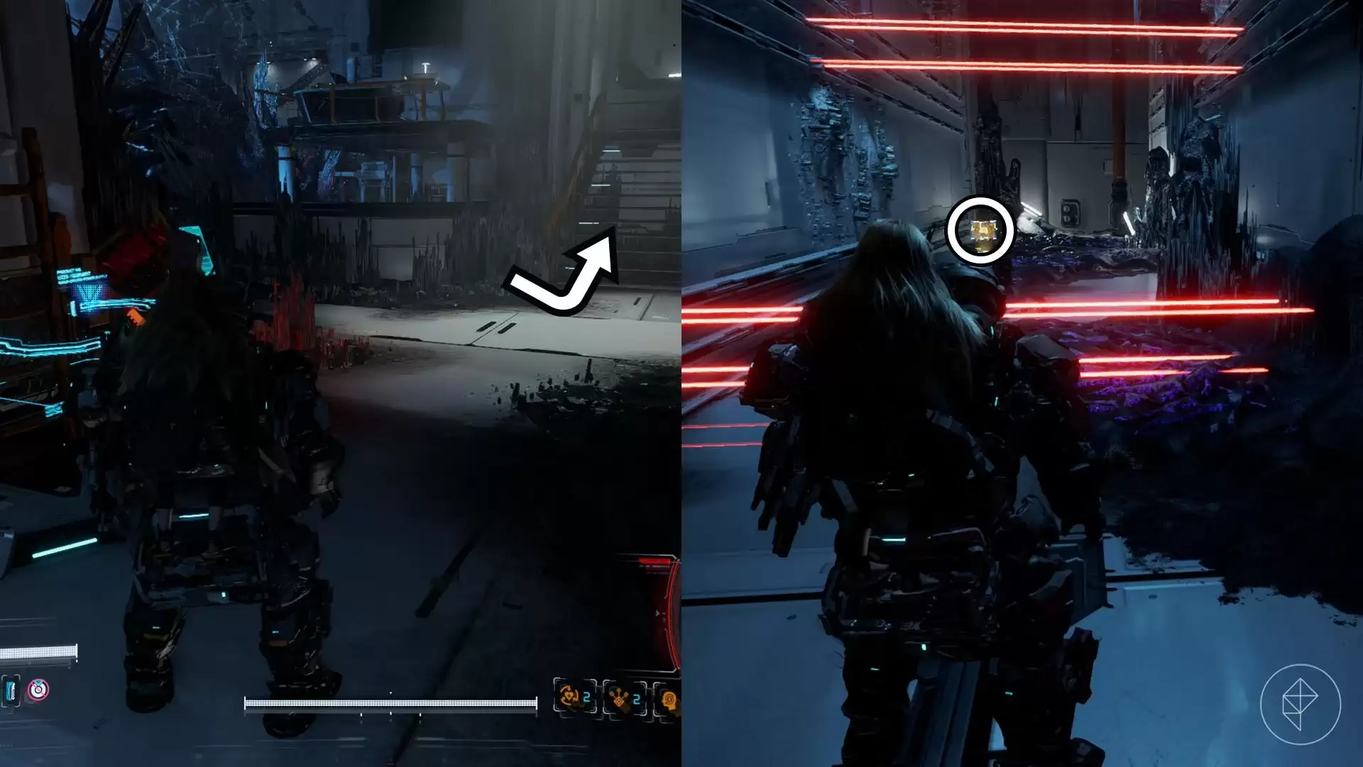 从货运站传送点出来,顺着楼梯往下走。在一个平台上,你就能发现第一个升级组件。
