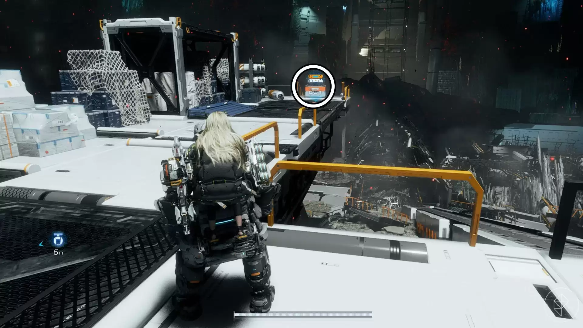 穿过研究区大门的舱门,你会走上一条沿着集装箱铺设的路径。仔细探索集装箱顶部,其中一个上面就藏着升级组件。