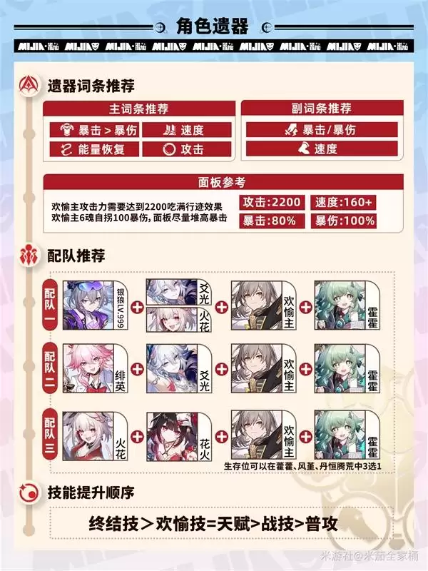 核心思路是构建一个“击破特化队”。主角自身拥有高额的击破效率,因此队伍需要围绕“快速破盾”和“击破伤害加成”来构建。理想队友之一是阮•梅,她能为全队提供高额的击破特攻加成、抗性穿透和加速,几乎完美覆盖了欢愉主角的所有需求。