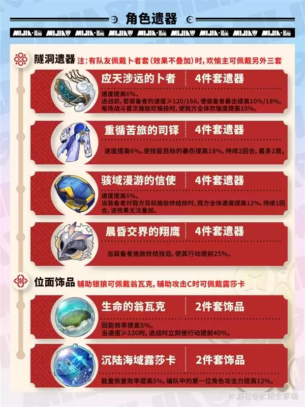 当前版本,遗器套装的首推方案是「机心戏梦的钟表匠」四件套。这套遗器的效果与欢愉主角的机制契合度极高:两件套直接提供宝贵的击破特攻属性;四件套则能在装备者释放终结技后,为全队提供持续3回合的速度加成。这不仅能优化主角自身的行动循环,还能带动整个队伍的节奏,属于功能性与伤害兼具的顶级选择。