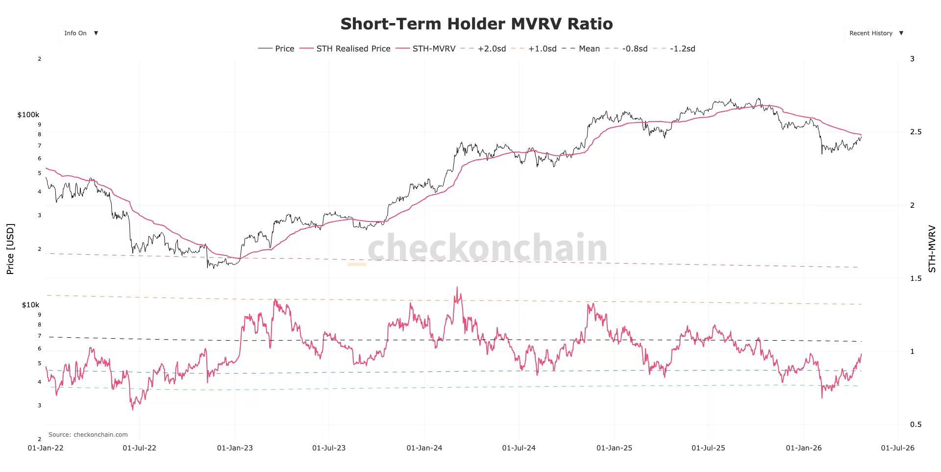 如果说真实市场均值反映的是整体市场的“心理水平”,那么短期持有者实际价格(STHRP)则代表了市场中最活跃、也最敏感的那部分资金的情绪。根据Checkonchain的数据,这个价位目前略高,在79,200美元左右。所谓短期持有者,通常指持币时间少于155天的投资者,他们对价格波动反应迅速,决策更容易受短期盈亏影响。眼下,现货价格正徘徊在他们的平均成本线之下,这意味着这批投资者整体上仍处于“浮亏”状态。历史经验表明,这个位置的压力不容小觑——今年1月中旬,比特币就曾试探过当时位于9.8万美元附近的STHRP,最终未能形成有效突破。