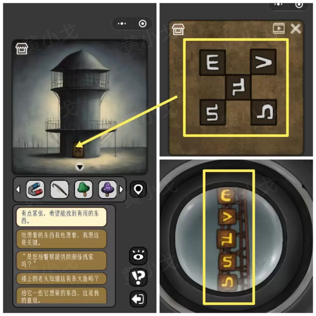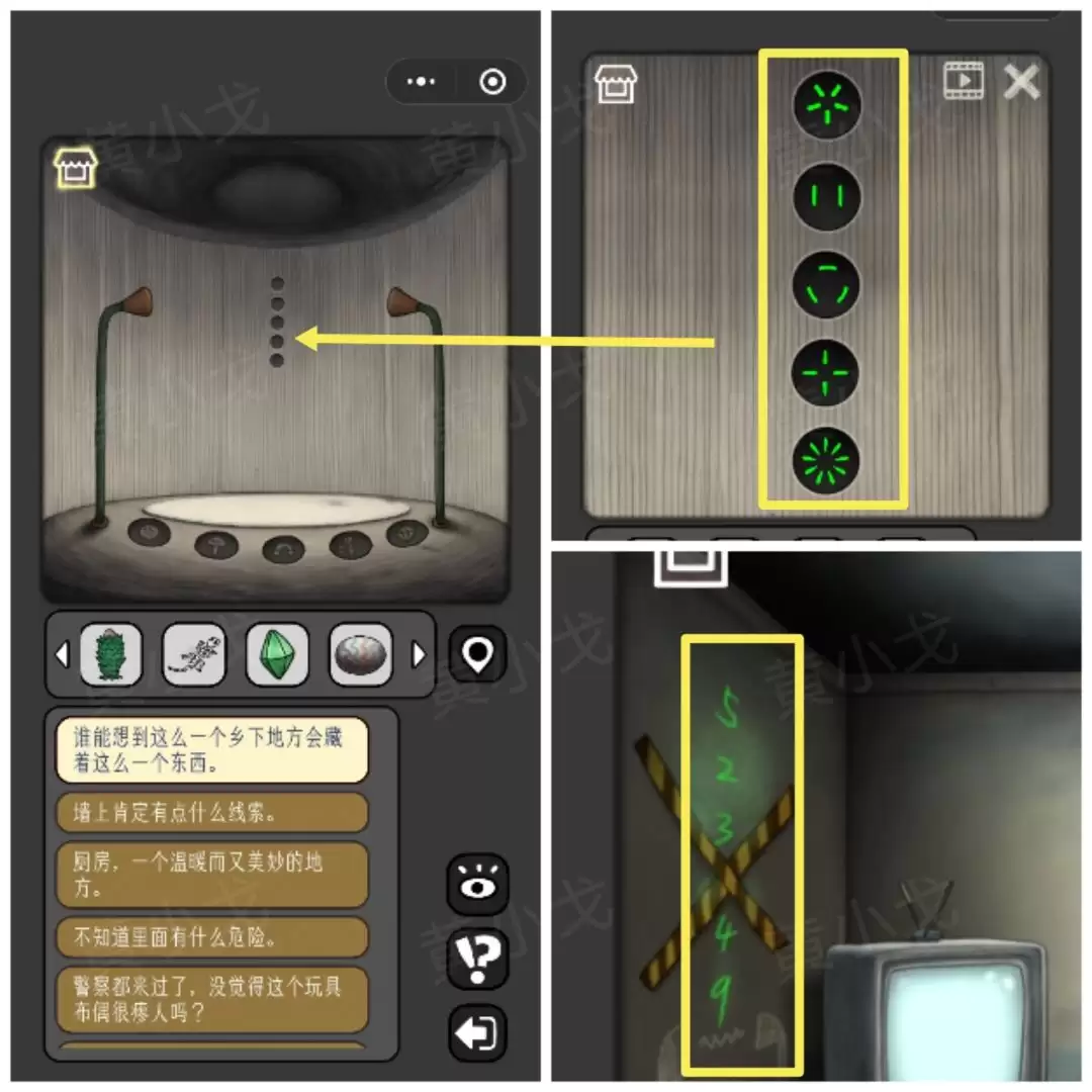 40. 进入水塔,墙上还有一个机关锁。这次,要对照电视墙显影出的数字“52349”来调整。提示一下,这个数字对应的是特定物品的笔画数。