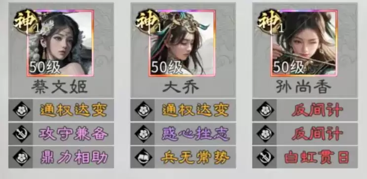 第三套,孙尚香追击队。暴击与追击,是这套阵容输出的两大引擎。通过两名辅助提供的增益效果,孙尚香的单体爆发能力能在短时间内急速攀升,这让阵容具备了不错的泛用性。组建起来,除了核心输出孙尚香本身获取难度稍高,其他位置的武将其实有调整空间,比如辅助位用黄月英替代也未尝不可,关键看谁的红度更高。