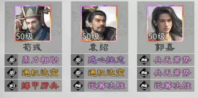 最后,来看看袁绍续航队。顾名思义,阵容以袁绍为核心,打造一支越战越强的成长型队伍。通过天赋叠加状态,配合技能联动,袁绍能在战斗中不断累积属性,造成的群体伤害范围广、压制力强,非常适合中后期的推进作战。多段群体打击能有效影响敌方整体状态,天赋的持续叠加也让队伍在持久战中游刃有余。郭嘉与荀彧的天赋,更能直接提升袁绍的输出与生存能力。