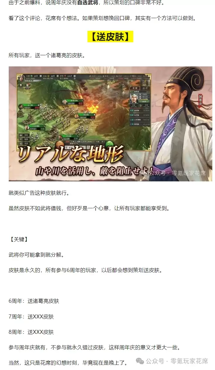 时间拉回到2025年周年庆之前,花席曾经提过一个建议,核心就是希望策划能考虑赠送诸葛亮皮肤。