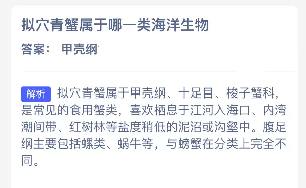 拟xue青蟹属于哪一类海洋生物? 【神奇海洋】2026年4月22日的新题目已经开放作答!正确答案现已公布,点击领取拼图,一起为修复海洋生态贡献力量吧!今天的正确答案是:【甲壳纲】。 话说回来,拟xue青蟹在分类学上的位置非常明确:它隶属于甲壳纲、十足目、梭子蟹科,是我们餐桌上常见的食用蟹类之一。 >