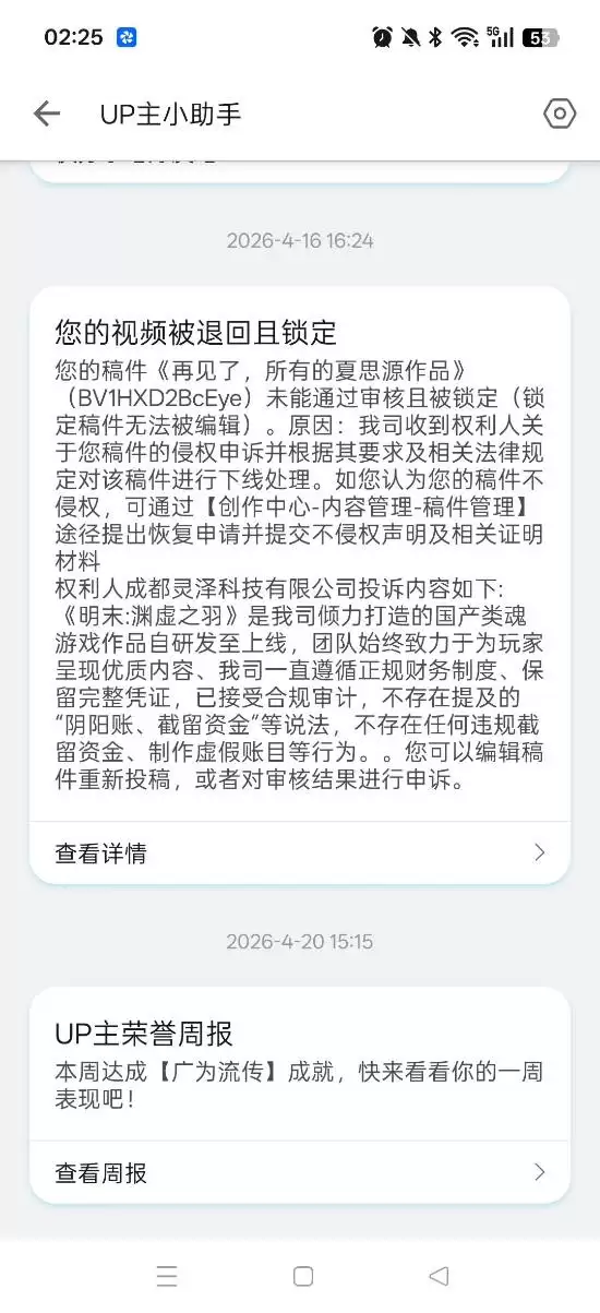 事情是这样的。一位网名为“九保杏树”的UP主发现,自己发布在B站上关于《明末》的视频稿件,突然被平台退回并锁定了。原因呢?是收到了权利人,也就是灵泽科技发起的侵权申诉。