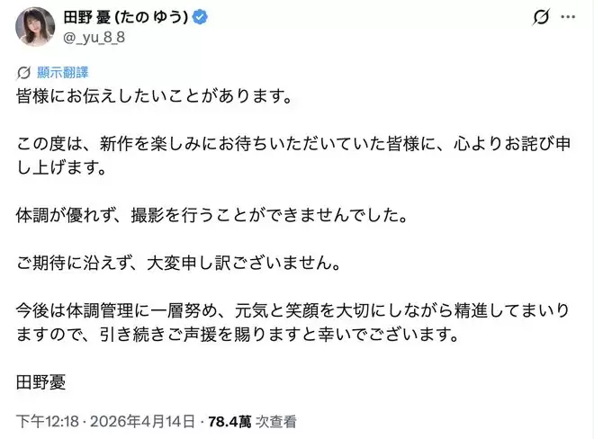 从她社群平台的更新动态来看,似乎一切如常,按理说不用太担心。但话说回来,对于一位专属女优而言,跳过固定的发片档期,总归需要给粉丝一个交代。这不,田野忧本人很快就发文说明了情况。