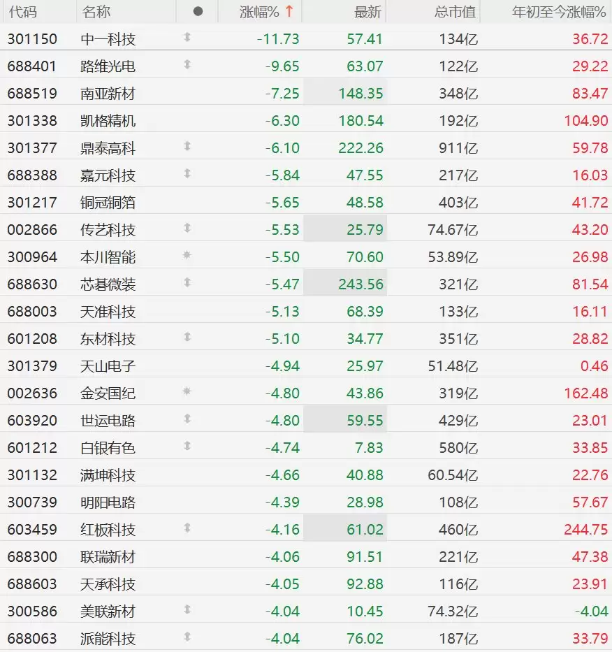 下跌名单进一步拉长:嘉元科技、铜冠铜箔、传艺科技、本川智能、芯碁微装、天准科技、东材科技等个股的跌幅均超过了5%。