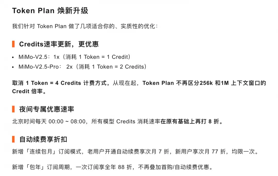 除了模型能力的升级,小米此次还同步调整了Token Plan的定价方案,这对开发者而言是个实打实的利好。主要调整包括两点:一是取消了原先1 Token等于4 Credits的计费方式;二是Token Plan不再区分256k和1M上下文窗口的Credit倍率,简化了计费逻辑。此外,还有一个颇具吸引力的“错峰优惠”:在北京时间每天凌晨00:00至08:00期间,所有模型的Credits消耗速率将在原有基础上再打八折。这无疑将有助于降低开发者的使用成本,并激励非高峰时段的任务调度。