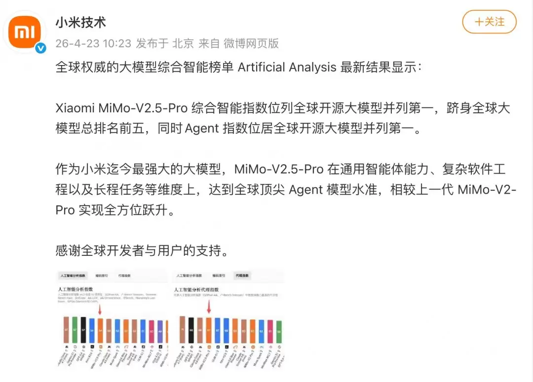 消息发布后,小米创始人雷军迅速转发了MiMo-V2.5-Pro的相关表现,并配文道:“继续进步!”