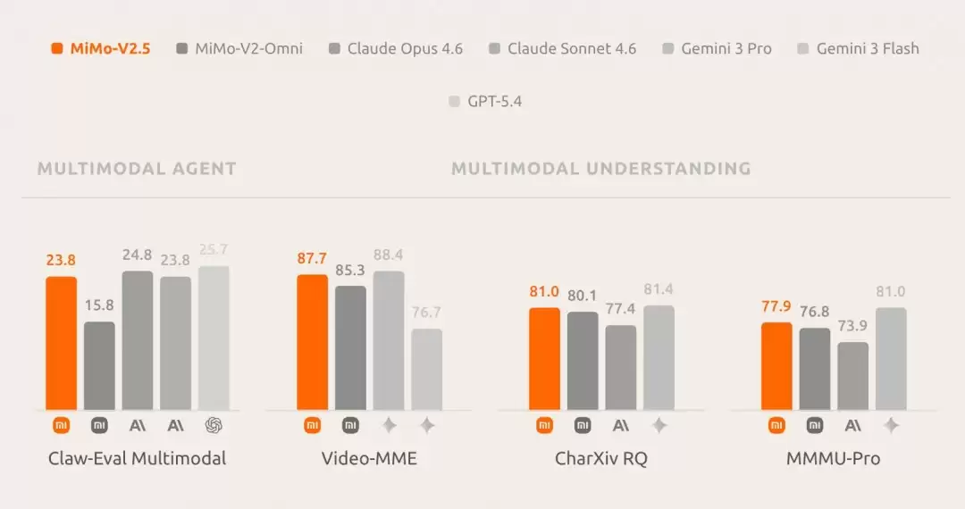 MiMo-V2.5在多模态理解方面同样进步显著。在全面评估AI智能体解决现实世界复杂问题能力的Claw-Eval多模态评测中,MiMo-V2.5取得了23.8分,相比V2-Omni的15.8分有了明显优化。