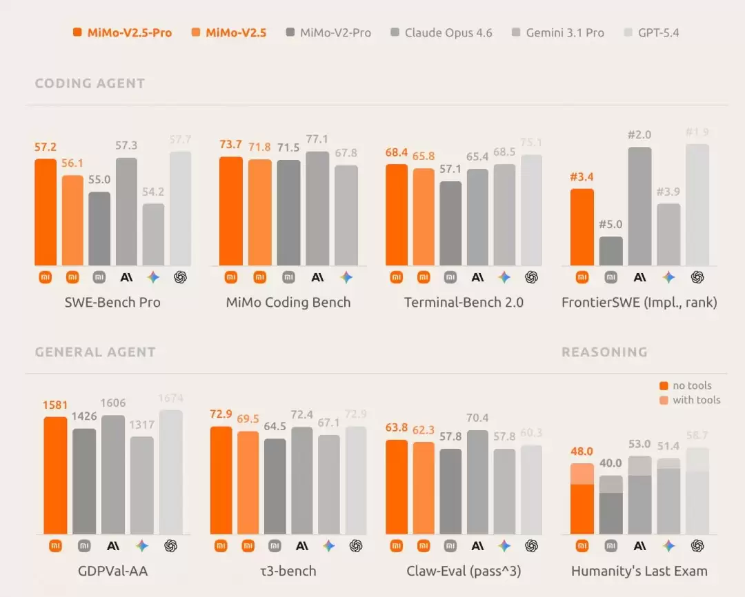 作为系列中的王牌,MiMo-V2.5-Pro被定位为“为长难Agent任务而生”。在通用智能体能力、复杂软件工程以及超长程任务处理这些关键维度上,它已经具备了与全球顶尖Agent模型如Claude Opus 4.6、GPT-5.4正面较量的实力,相比上一代的MiMo-V2-Pro,可谓实现了全方位的跃升。
