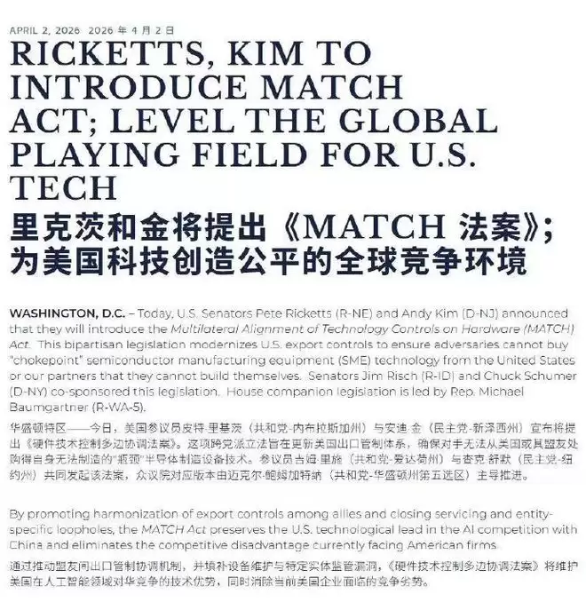 这意味着什么?意味着只要日本方面愿意松口,将这两类设备供给中国市场,那么绕开ASML的EUV封锁,自主生产5纳米芯片便成为可能。而这,恰恰是某些力量最不愿看到的局面。为了彻底堵死这条“后路”,一项被称为“史上最严”的《MATCH Act》法案被推上前台。该法案不仅禁止向中国出售新的先进设备,甚至连现有设备的维护与技术支持都要切断,这无异于将利用存量设备进行技术迭代的道路也彻底焊死。其目的很明确,就是胁迫日本、荷兰等盟友构建一个密不透风的对华技术封锁网。