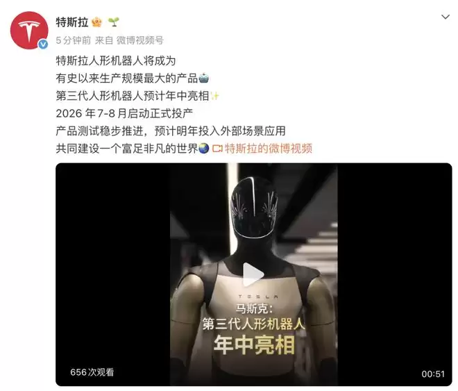 特斯拉官博发文表示, 特斯拉人形机器人将成为有史以来生产规模最大的产品。