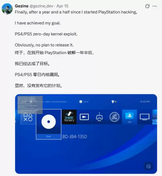 4月15日,在PS破解圈内颇具名气的韩国黑客Gezine,通过社交媒体发布消息,称自己同时破解了PS4和PS5的系统内核,并找到了一个零日漏洞。所谓零日漏洞,指的是软件厂商尚未察觉、因此也无法及时修补的安全缺陷,其威胁性往往最高。