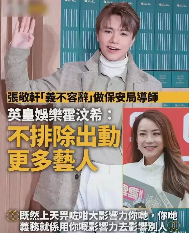 面对如此局面,英皇娱乐似乎也有些着急了。公司旗下多位艺人,如容祖儿等,纷纷出面“力挺”张敬轩参与的保安局项目,称赞他热心公益、充满正能量。