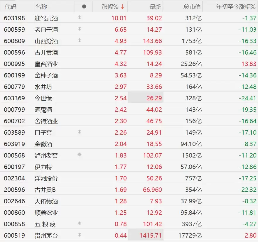 白酒板块集体飘红,迎驾贡酒强势涨停