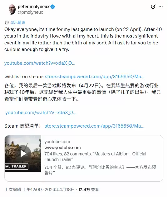今天,游戏界一位耕耘了四十载的老兵,彼得·莫利纽兹,在社交平台上揭晓了他的“收官之作”——《阿尔比恩之主》。