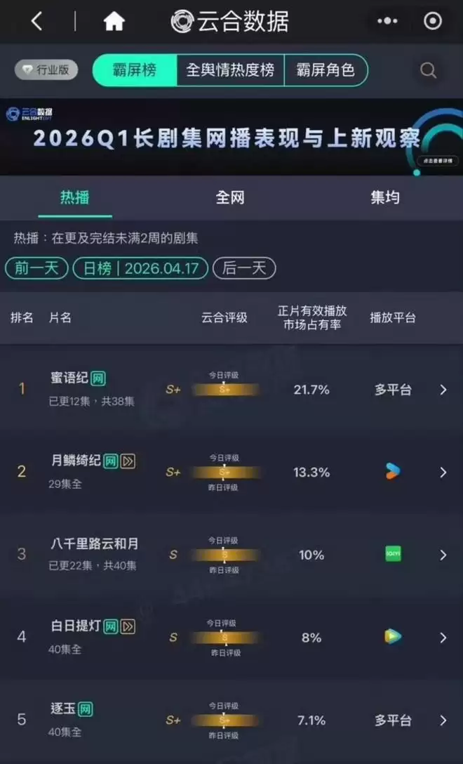 《蜜语纪》于4月13日开播,其网络双平台的首日热度表现均超出预期。尤其在鹅厂平台,其单日热度甚至能与迪丽热巴主演的《白日提灯》分庭抗礼。此后,该剧热度一路高歌猛进,每日霸占榜单前列,至4月17日已跃升为S+级别的项目。按照这个势头发展,倘若后续剧情能出现更具破圈效应的“高光时刻”,这部剧集的热度破万,恐怕并非遥不可及。