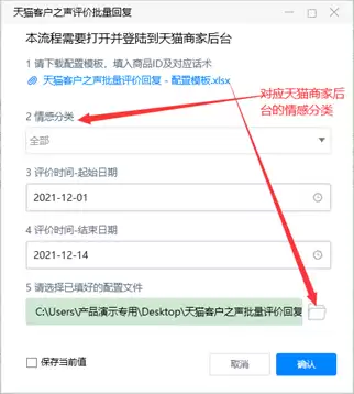 首先,你需要导出名为“天猫客户之声批量评价回复--配置模板”的Excel文件。在模板的A列,准确填写你需要回复的商品ID。然后,在与商品ID同行的“随机话术”列中,填入你准备好的回复内容。这样设置后,流程便会自动为对应商品的所有评价进行批量回复。