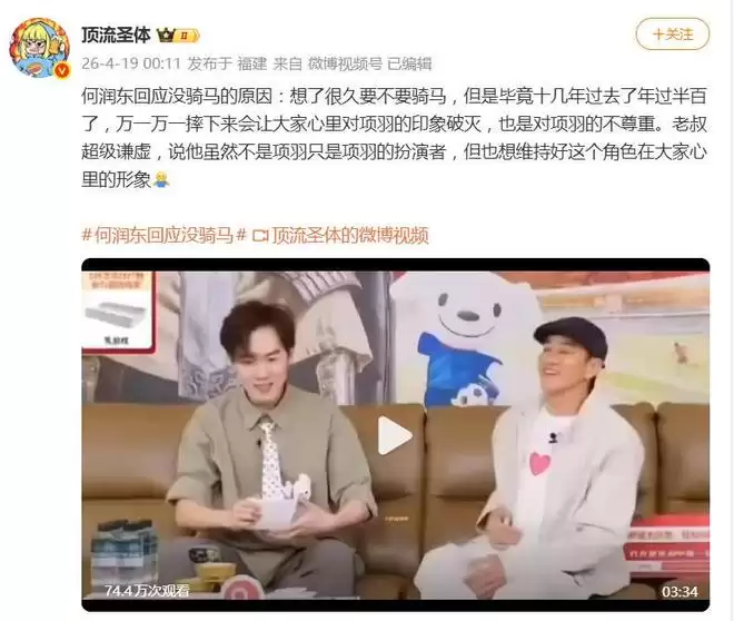 这份“有把握”,其背后更深层的动力,来源于对角色近乎神圣的敬畏。何润东强调,自己虽然只是项羽的扮演者,却肩负着维护这个英雄角色在公众心中形象的责任。“我想了很久要不要骑马,”他说,“万一摔下来,会让大家心里对项羽的印象破灭,这也是对项羽的不尊重。”在他眼中,个人的一时风光,远不及维护“霸王”在观众心中崇高感的万分之一重要。这份清醒,也让不少网友感慨:“挺真诚的,他看重的不是自己,而是项羽的形象。”
