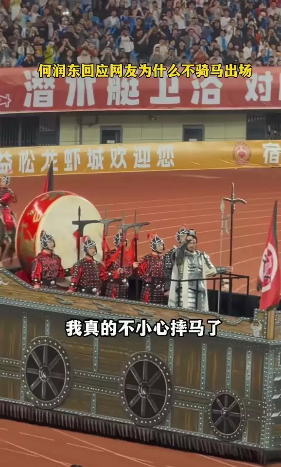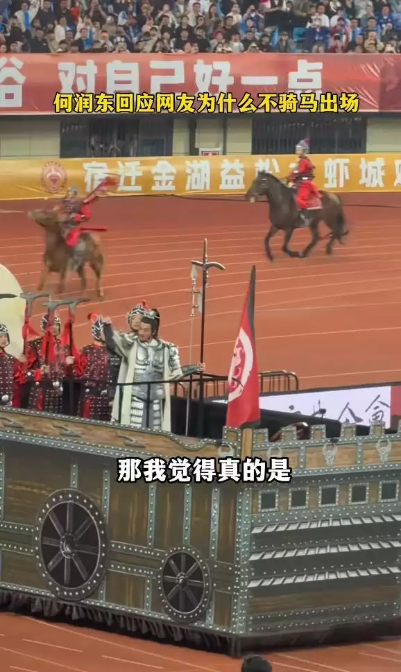 4月18日晚,江苏宿迁的“苏超”联赛主场,上演了令人印象深刻的一幕:何润东以一袭经典的“西楚霸王项羽”造型亮相,瞬间点燃了全场气氛。然而,当观众发现这位“霸王”并未如期待中策马登场,而是驾着战车绕场时,好奇与疑问也随之而来——当年的马上英雄,为何今日不骑马了?