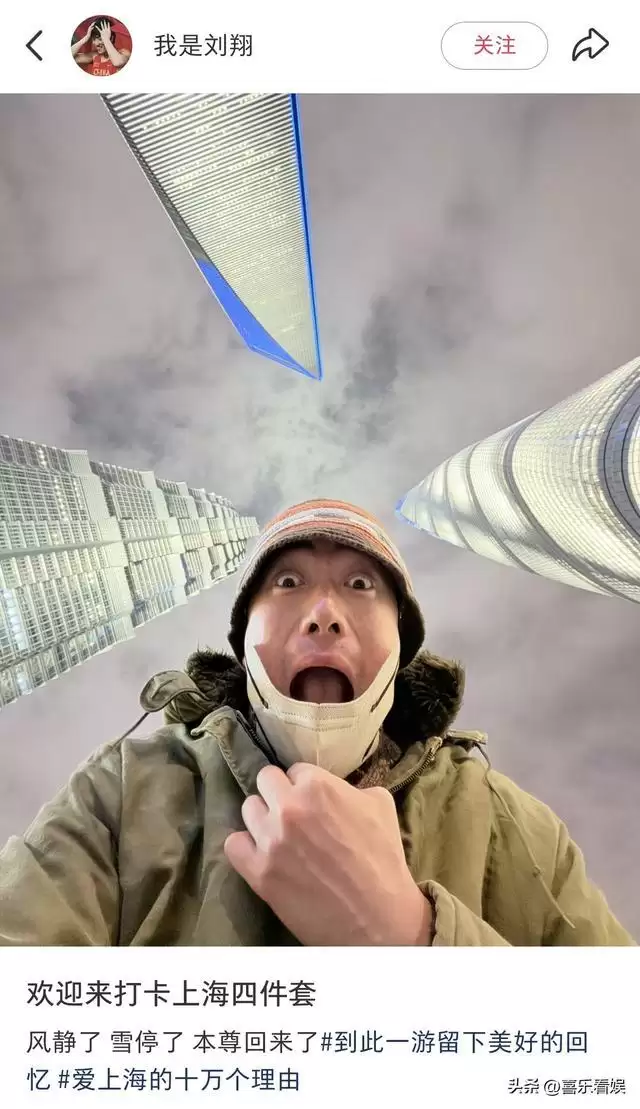 他在国内的日常,也充满鲜活的生活气息。今年1月,他曾在社交平台晒出打卡上海陆家嘴“三件套”的照片,配文:“风静了,雪停了,本尊回来了”,还调侃自己与建筑群组成了“上海四件套”。