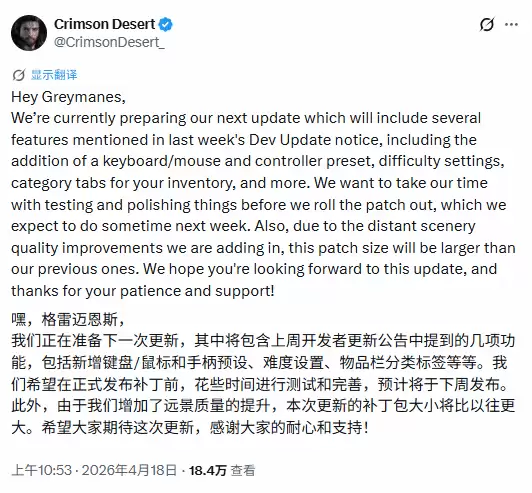 今天,《红色沙漠》的官方X账号发布了一条新动态,确认游戏的下一次更新已经进入最后准备阶段。消息一出,立刻在玩家社区中激起了不小的水花。
