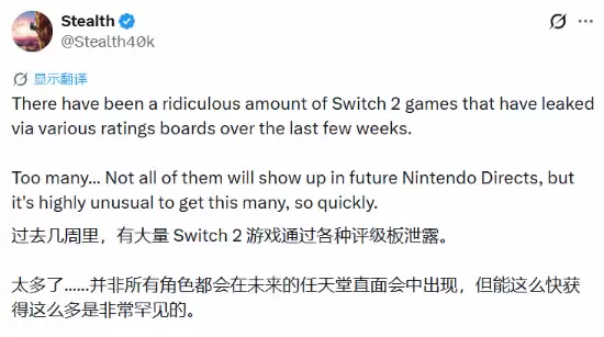 知名任天堂粉丝博主Stealth透露了一个有趣的现象:过去几周里,大量Switch 2游戏通过评级信息被曝光,无论是泄露的规模还是速度,都相当不寻常。