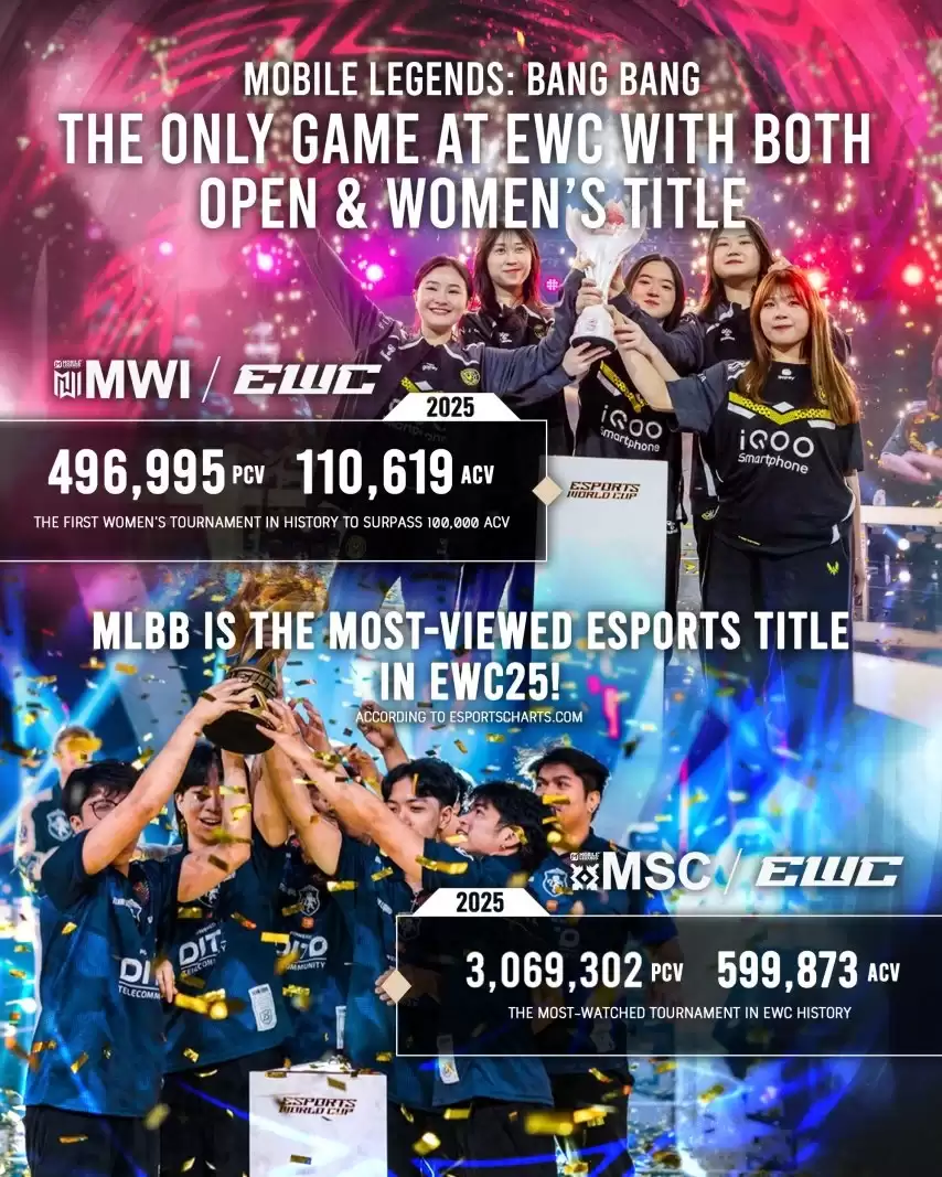 市场数据也印证了这一升级的成功。据Esports Charts数据显示,在2025年电竞世界杯期间,《决胜巅峰》的两项赛事均创下了收视纪录:MSC成为该赛事历史上海外观看人数最高的赛事,也是首个峰值同时观看人数突破300万的电竞赛事;MWI则创下了赛事开办以来的最佳收视表现,峰值同时观看人数突破49.6万,同时成为史上首个平均同时观看人数突破10万的女子电竞赛事。这些数字,无疑彰显了全球市场对于女子电竞的旺盛需求。