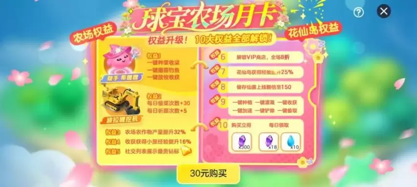 如果追求更高效的经营体验,开通「花仙岛月卡」会解锁一系列丰厚权益:购买立得300花灵币、每日稳定领取18花灵币加10点体力、VIP商店享受全场5折、一键完成日常操作、体力储存上限翻倍等共计十大特权,堪称田园生活的“翻跟斗”。