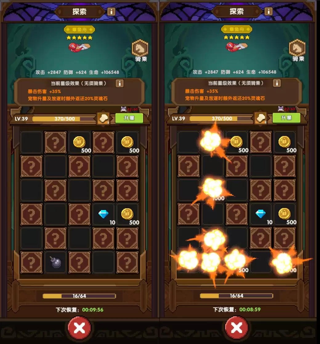点击任意一个坐骑,就能进入它的专属【探索】玩法。这个玩法有点像挖宝:消耗探索次数翻开格子,随机收获水晶、金币、加速卷轴等道具。运气好的话,还能挖出“冲击波”,点击一下就能炸开十字范围内的所有格子,效率瞬间提升。探索次数每10分钟自动回复一点,规划好使用节奏很重要。