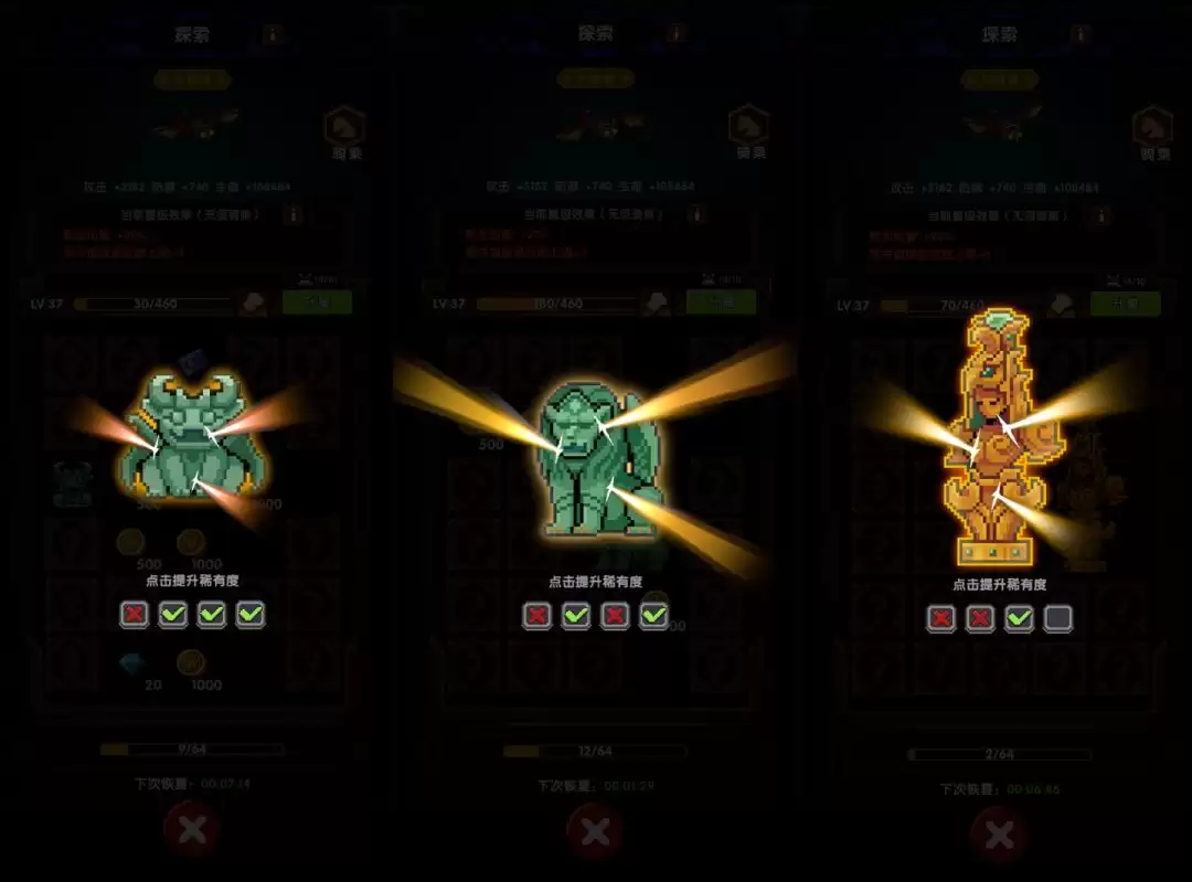 探索过程中,你的终极目标是找到并开启雕像奖励。一旦成功,不仅通往下一关探索的道路会立即开放,你的坐骑也能获得一笔可观的经验值。每尊雕像都有4次提升稀有度的机会,记住一个原则:雕像本身的品质和最终的稀有度越高,你拿到手的奖励就越丰厚。