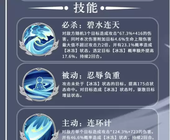 陆逊的控制体系,核心就围绕两个字:冰封。他的必杀技“碧水连天”是这套体系的发动机,能对三名随机敌方目标造成伤害。这伤害可不一般,附带基于目标生命上限的额外打击。但真正的精髓在于那“不讲道理”的冰冻概率——对选定的主目标,冰冻几率还会额外提升,效果持续整整两个回合。实战中,这个技能往往能同时摁住两个对手,让他们连技能都放不出来,直接打乱对方的进攻节奏。尤其在面对多人群攻阵容时,这种群体冰冻的控场能力就显现出来了,能为整个团队扛下大量伤害。