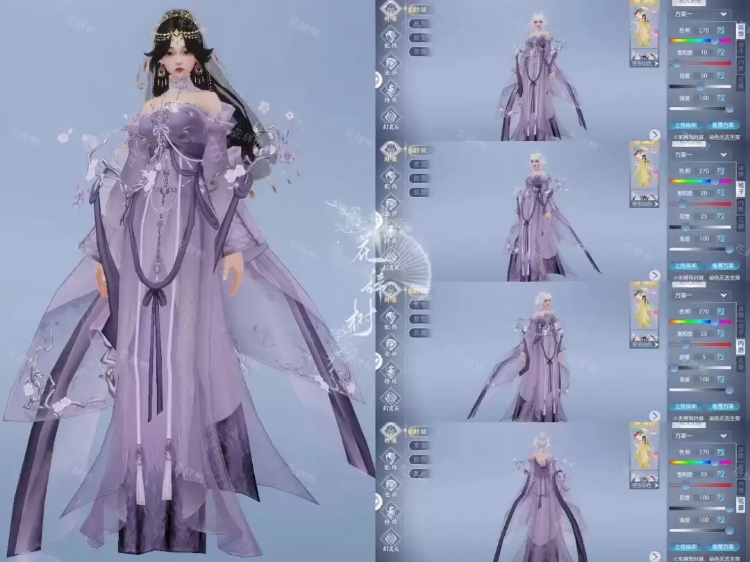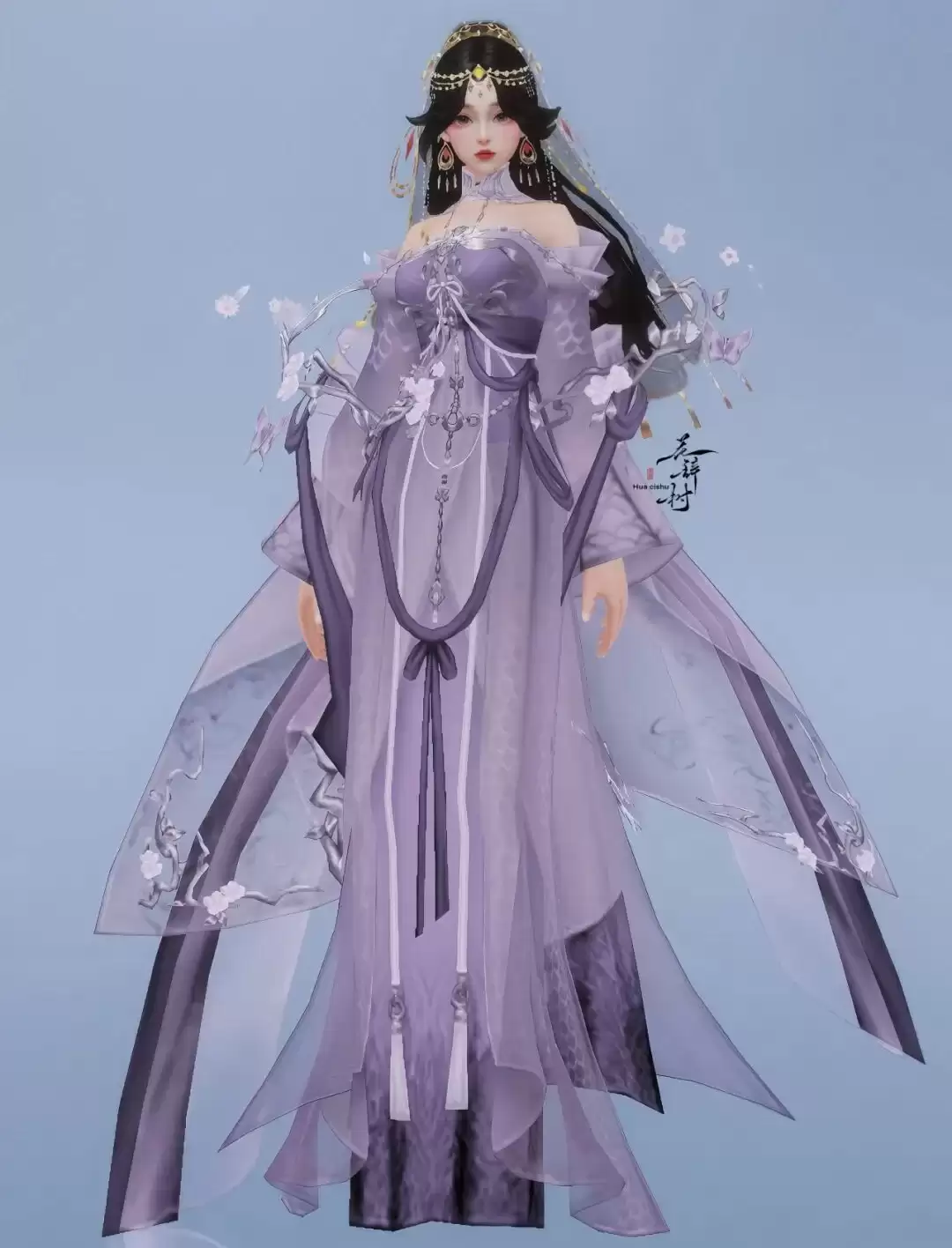 与淡紫的柔美截然不同,暗紫色系走的是深邃华丽的路线。颜色浓郁如熟透的葡萄,又似夜幕下的丝绒,质感十足。这套配色能极大提升时装的贵气与神秘感,气场瞬间拉满,适合想要展现沉稳与魅惑一面的仙友。