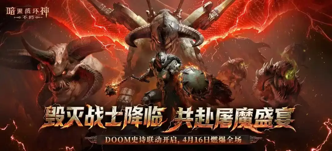 《暗黑破坏神:不朽》×《DOOM》联动开启!限时玩法“撕裂地狱”上线,登录即领传奇宝石“裁决剑”,化身毁灭战士穿戴联动皮肤,免费获取使魔皮肤。2026年4月16日-5月13日,地狱军团降临,立即加入战斗!
