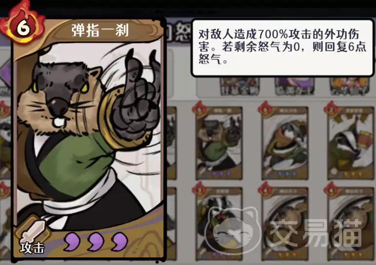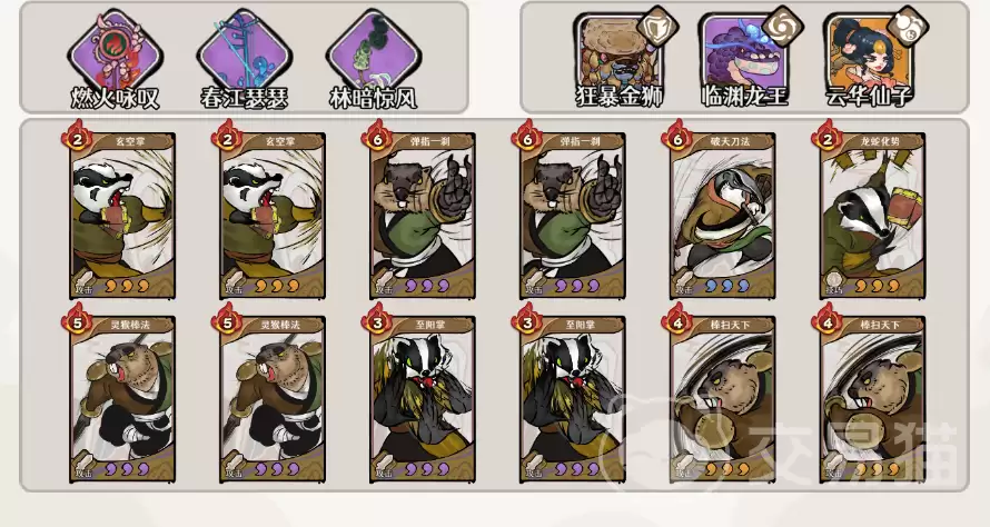 - 输出端:必须带上弹指一刹、灵猴棒法、至阳掌。它们的任务很明确——全是高费用的土系技能,目的就是每一张牌都打出去,把怒气消耗值“撑”到最高。