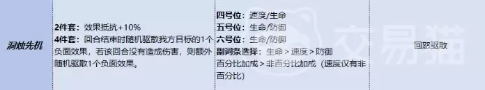 如果你的队伍更需要应对频繁的控制,那么洞烛先机就是解局的关键。这套锦囊主属性提升10%抗性,同时兼顾速度与生命上限。但它的精髓在于被动效果:每个回合结束时,会随机清除己方一名角色身上的负面状态。
