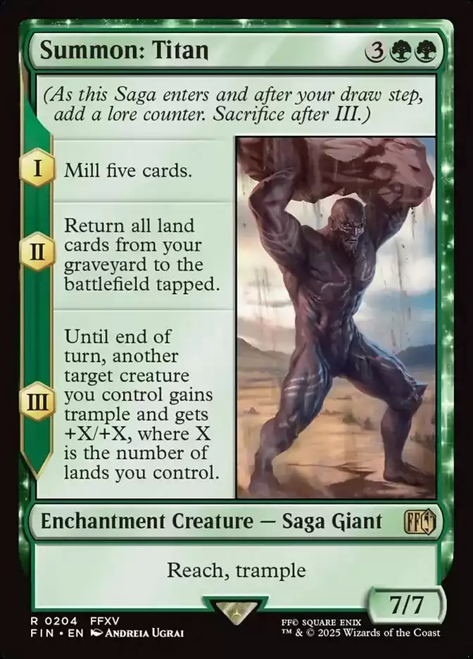 规则变动的影响远不止于卡价。它直接为构筑赛制,尤其是标准赛制,打开了全新的思路。以Summon: Titan这张传纪为例,它在地落或磨牌库套牌中表现强势。其弱点在于,进场后磨五张牌的第一章效应生效后,很容易被对手的去除咒语瞬间解掉,导致无法享受到后续将地牌移回战场的巨大收益。