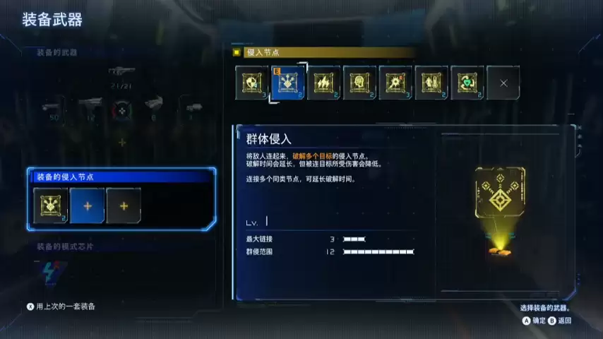 随着流程推进,逐步解锁各种芯片后,入侵路线上会出现带有特殊效果的黄色节点。玩家需要在绘制入侵路线时刻意穿过这些节点,来触发芯片的增益效果。