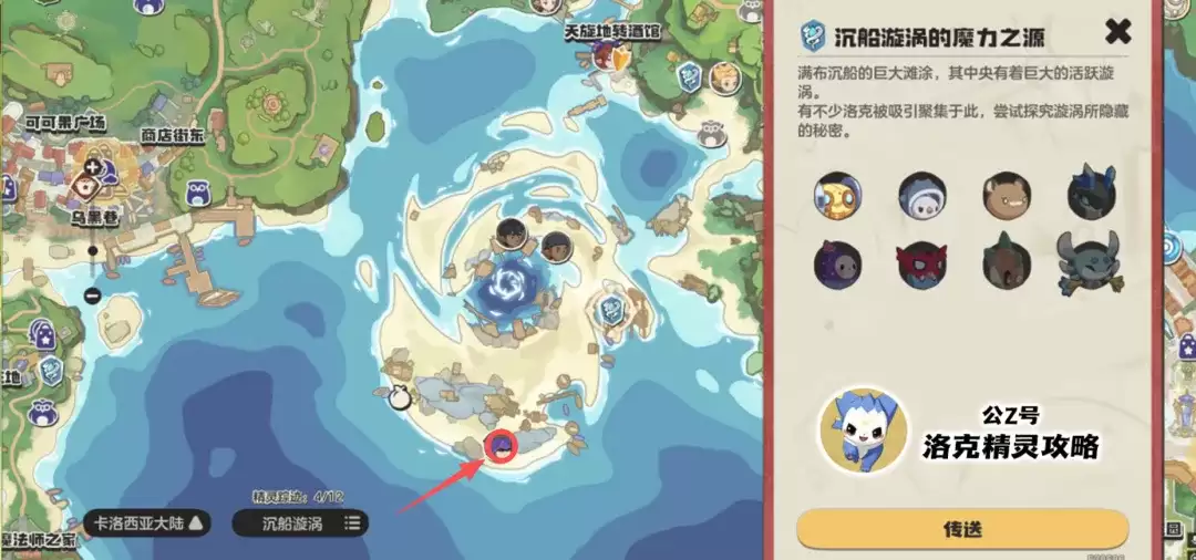 接下来,传送至下方的“沉船漩涡”传送点。来到下图所示位置,黑巫师便在此等候。战胜他,收获熟悉的奖励组合:30万洛克贝、50个光水晶和1瓶进化药水。